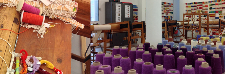 Notre visite commence au sommet du bâtiment par l’atelier qui, après une parenthèse de vingt ans, forme à nouveau des lissiers, aujourd’hui via le GRETA Creuse, permettant des reconversions à tout âge. Une grande salle blanche et lumineuse, occupée par une quinzaine de métiers à tisser et égayée des mille et une couleurs des bobines de fils de laine. Au bout de deux ans d’enseignement, de stages en entreprise et de workshops, les élèves, sélectionnés sur test et entretien, obtiennent un CAP puis le Brevet des Métiers d’Art (BMA) Arts et techniques du tapis et de la tapisserie de lisse. Cette année, encadrées par la plasticienne Delphine Mangeret passée elle-même par l’ENAD, elles sont une dizaine à suivre la formation, âgées de 19 à 50 ans. Car contrairement aux années précédentes, le groupe est ici exclusivement composé de filles, sachant que, exemple rare, la profession de lissier autrefois masculine est devenue à notre époque essentiellement féminine.