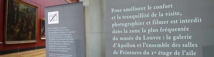 [1] La mesure entra en application le 14 septembre 2005 et concernait la Galerie d’Apollon, l’ensemble des salles de peintures du 1er étage de l’aile Denon (salles de peintures italiennes, espagnoles et françaises) et le palier où est exposée la Victoire de Samothrace. Nous pensions que le rétablissement du droit de photographier était intervenu au bout de quelques mois, il semblerait que ce soit plus tard, en 2007.