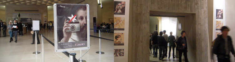 Dès le Hall Napoléon, sous la pyramide, le visuel d’interdiction du flash est présent dans les files d’attente des caisses, ainsi qu’au seuil des quatre portes d’entrée principales du musée, accompagné des autres visuels de la campagne de bonne conduite. Ils sont tout autant visibles dans le dépliant de visite distribué en de multiples langues ainsi que les mentions explicites d’interdiction et d’autorisation photographique [9]. Ensuite, dans le musée, ils se font plus discrets. On les retrouve parfois au mur à côté du plan du musée. A certains endroits, comme à l’entrée de la Grande Galerie, les règles sont rappelées à minima, sans les visuels de la campagne, sur un austère panneau gris.