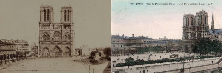 Pour Notre-Dame, c’était trop tard. Georges Eugène Haussmann était passé par là. Même si le lacis médiéval, mythifié par le roman de Victor Hugo, avait disparu de cette zone bien avant le préfet, à partir du 18e siècle pour laisser place à des bâtiments hospitaliers beaucoup moins pittoresques. Les démolitions orchestrées dans les années 1870, décidées en 1865 et terminées en 1878 après la chute du Second Empire dont Haussmann fut le serviteur zélé, avaient dégagé un gigantesque espace devant la cathédrale, plus que triplant la surface de son parvis déjà agrandi au 18è siècle et englobant la place d’armes de la caserne devenue Préfecture de police de Paris. Une « nécessité » selon le préfet de la Seine, pour gagner de la place « toujours insuffisante les jours de solennités nationales » [3]. La place était juste réduite par un square longeant le quai côté Seine et une rangée d’arbres en façade du nouvel Hôtel-Dieu.