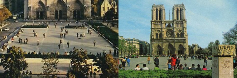 Les décennies passant, toujours les mêmes reproches. Les aménagements cosmétiques du parvis des années 1910 n’avaient pas effacé cette impression de désert. Avec l’historien de l’art, journaliste et défenseur du patrimoine (antihaussmannien) Yvan Christ, il trouva son détracteur le plus acharné [44]. En 1958, celui-ci le qualifiait de « lieu le plus morose de Paris » [45]. En 1960, dans une tribune au titre éloquent (« Supprimer le parvis Notre-Dame »), il en parlait comme de « l’une des hérésies historiques et esthétiques les plus déplorables du XIXe siècle » [46]. Avant d’asséner ironiquement : « Une cathédrale gothique n’a jamais été conçue pour décorer une place ». En 1967, il débordait de mépris pour « ce parvis sans esprit, sans âme et sans forme » [47]. En 1971 encore, il en faisait une évidence : « Qui ne déplore la démesure et la médiocrité du désert de bitume imaginé il y a cent ans par l’urbanisme impérial ? Place immense et inhumaine... » [48]. En 1973, il s’apitoyait sur « ce triste désert de bitume » [49]. Entre temps, les critiques avaient fini par porter leurs fruits.
