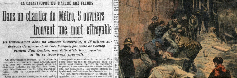 Les travaux du métro étaient impressionnants. D’énormes caissons étaient montés sur place puis enfoncés dans la terre afin de créer un tunnel devant passer sous la Seine. Une prouesse technique, puisqu’il s’agit du premier tronçon du métro parisien immergé. Hélas, le chantier connut un épouvantable drame, qu’aucune plaque ne rappelle. Une avant-veille de Noël, le 23 décembre 1907, cinq ouvriers périrent dans un caisson, suite à un accident de pressurisation, comme le relate Le Petit Parisien. Et, quelques semaines plus tard, un terrassier perdit la vie, après une blessure à la tête [9]. Par ailleurs, la station du métro nécessita la construction d’une usine électrique sur l’île même. Le bâtiment, propriété de la RATP, existe toujours à deux pas de Notre-Dame.