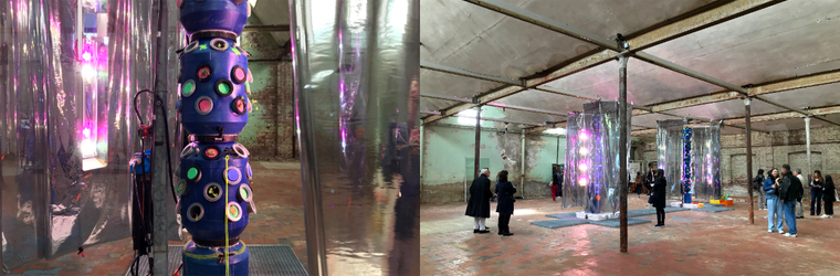 Outre les deux colonnes de culture aéroponique, l’exposition intitulée « Une autre fin du monde est possible », présente d’autres sculptures-machines parmi lesquelles des ventilateurs de plafond aux palmes remplacées par des rhombes, instrument à vent ancestral de communication avec les morts, lestés de paires de baskets ; une armoire électrique alimentée par un système à base de jus de betterave ; 220 piles voltaïques baignant dans un liquide, « bleu comme l’indigo dont on teignait le tissu dans les filatures rouennaises » explique la commissaire Julie Faitot, emplissant les goulottes du local par où passaient les conduits électriques… Un intriguant laboratoire de fortune post-apocalyptique, auto-suffisant, poétique et fonctionnel.