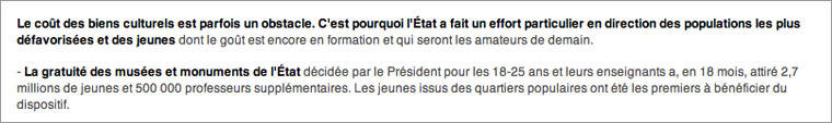 Dédaignant ce terrain-là, pourtant au coeur d’une réelle politique de démocratisation culturelle, le président préfère parler chiffre et quantité, domaine où il est plus à l’aise. Et là encore, c’est pour faire illusion. Il affirme : « Je faisais le bilan avec le ministre sur les 18 premiers mois de gratuité pour les jeunes. Le nombre de visites imputables à cette mesure est de près de 3 millions de jeunes de 18 à 25 ans dans les musées, qui ne seraient pas venus sans cette mesure. Et, tenez-vous bien, 500 000 enseignants. ». Si ces chiffres sont certainement exacts, ils ne constituent en rien la preuve de l’impact de la gratuité. Ils indiquent juste le nombre de visiteurs de ces deux catégories ayant visité un musée ou un monument national durant la période. Le président fait comme si, avant avril 2009, aucun jeune ni enseignant ne fréquentait les musées, ce qui est totalement absurde. Plus fort encore, le site Internet de l’Elysée présente ces visiteurs - les ramenant à 2,7 millions de jeunes et 500 000 enseignants -, comme étant « supplémentaires ». A qui ? Il n’y en a pas eu d’autres !