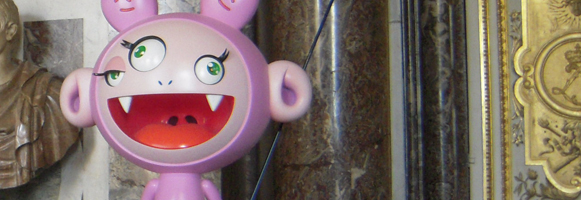 « As well as taking his aesthetic cue from the Disney-infected world of popular entertainment that is so endemic in contemporary Japan, Murakami’s own art historical roots are as evident in the current exhibition of his works in the Château de Versailles, where he follows in the footsteps of Jeff Koons in being invited to exhibit in those opulent and historic surroundings, as they are in Kaikai Kiki . Indeed Kaikai and Kiki have been placed on guard within the Louis XIV salon at the Château de Versailles in the present exhibition. »
